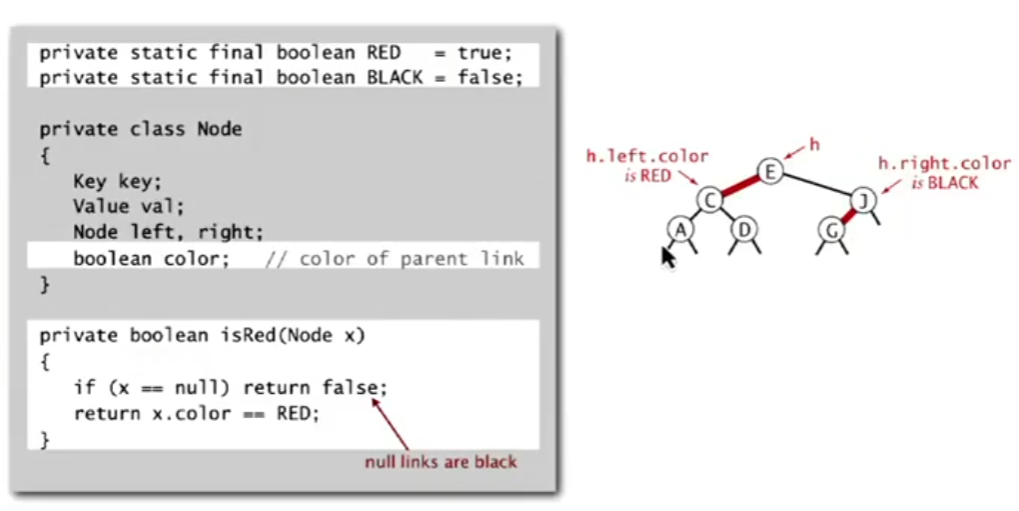 在上面的实例中,E-C直接是红色,所以我们可以将红色存在C结点中;
