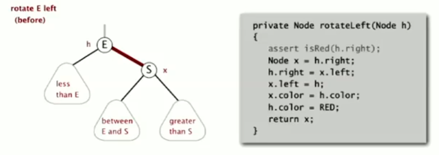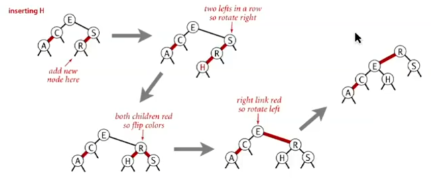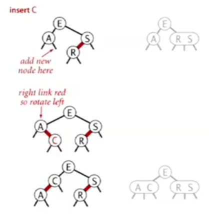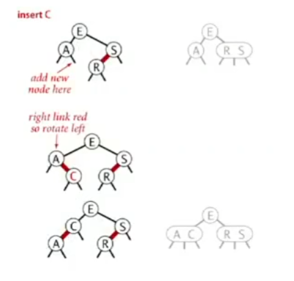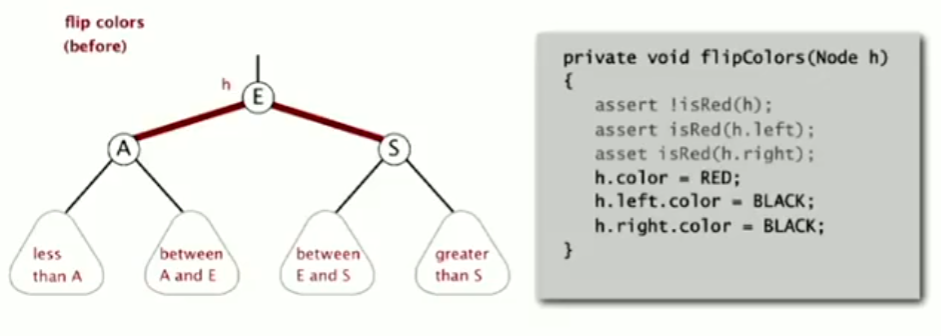 颜色翻转:这是模拟2-3树的生长过程的操作,(我们会暂时构建出一个4-结点,然后再将其分裂),在红黑树中,我们只需要改变颜色即可 将E-A、E-S改为黑的操作实现了分裂,而将E改为红则体现了将E加入其父节点的生长过程