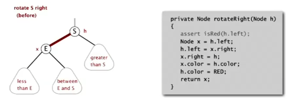 三种基本操作 右旋:和左旋同理,即使在一个左倾红黑树中,我们有时也需要暂时地让树的部分变为右倾 需要注意的是,左旋右旋都没有改变结点的相对大小关系,也没有破坏黑色平衡,这只是一种调整手段
