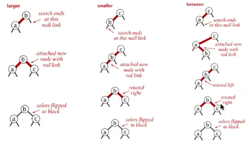 进行标准的BST插入,将新连接(结点)的颜色设置为红 (如果构成的4-结点不平衡)旋转以平衡4-结点 进行4-结点的颜色翻转,将红色向上传递 (如果右倾)旋转使其左倾 下面是向一个只有两个结点的树插入一个结点的分类讨论,上面的流程很大程度上是从下面的分类讨论中总结出来的